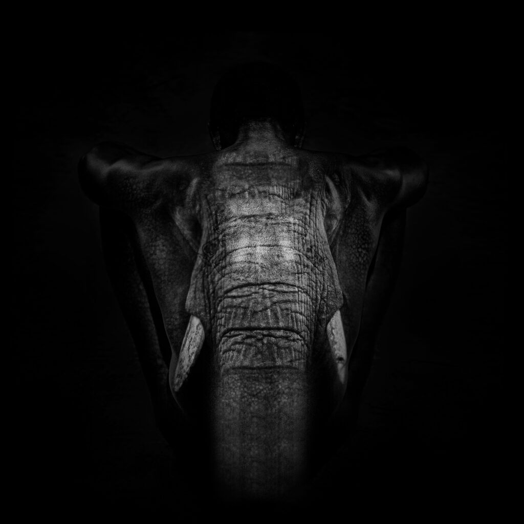 “I just fell in love with them,” Giuliano Bekor exclaims when asked why the majestic elephant is the focus of his latest projection series collection. Indeed, with an artist’s eye and a philosopher’s heart, Bekor uses his lens and his unique mastery of the projected image on human form to explore the elephant in all its power, wisdom and glory.In this collection, we see the intertwining of common force, we feel the thrill of sought-out danger, we experience rebirth of the ego into the wider universe. The sculpted lines of muscle and flesh are married with the trunks, the tusks, the leathery textured skins, and the deep, eternal gaze of the giant mythical creature.